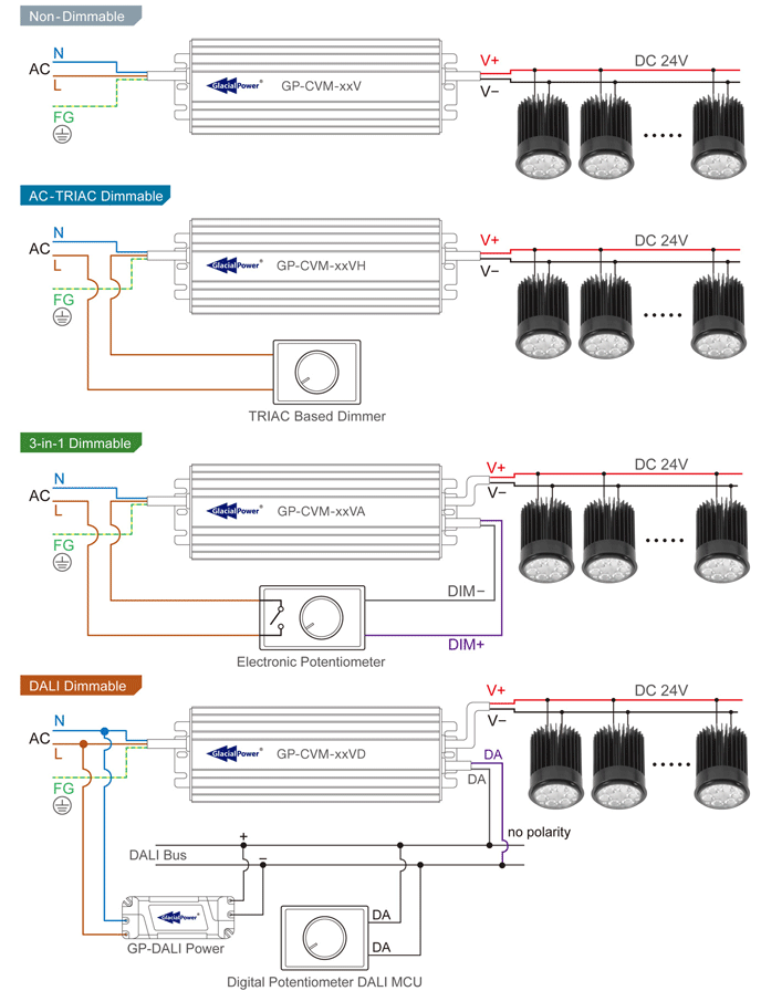 The GL-LMR50-12-24V-NL features a mistake-proofing design to connect a DC 24V power input for user friendly. The installers do not need to distinguish the polarity between the positive and the negative poles of power input; it makes easily and avoids damaging the units with wrong polarity power input. This new product also comes in a parallel expandable design. It can directly connect lots of DC lighting fixtures with one constant voltage driver if it provides enough watts. It saves extra LED drivers fee and working hours.