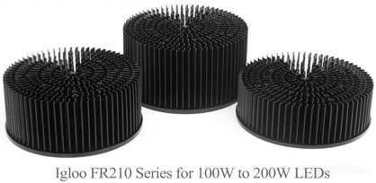 The Igloo FR210 series using AL1070 aluminum, with thermal resistance at 0.81 °C/W for Igloo FR210B, 0.70 °C/W for Igloo FR210C, and 0.64 °C/W for Igloo FR210D. These new heatsinks have different thick bases from 6 mm to 8 mm, to address the specific needs of LED Technology. With a thicker base, heat dissipation spreads over a larger area for the heatsink to operate more effectively.