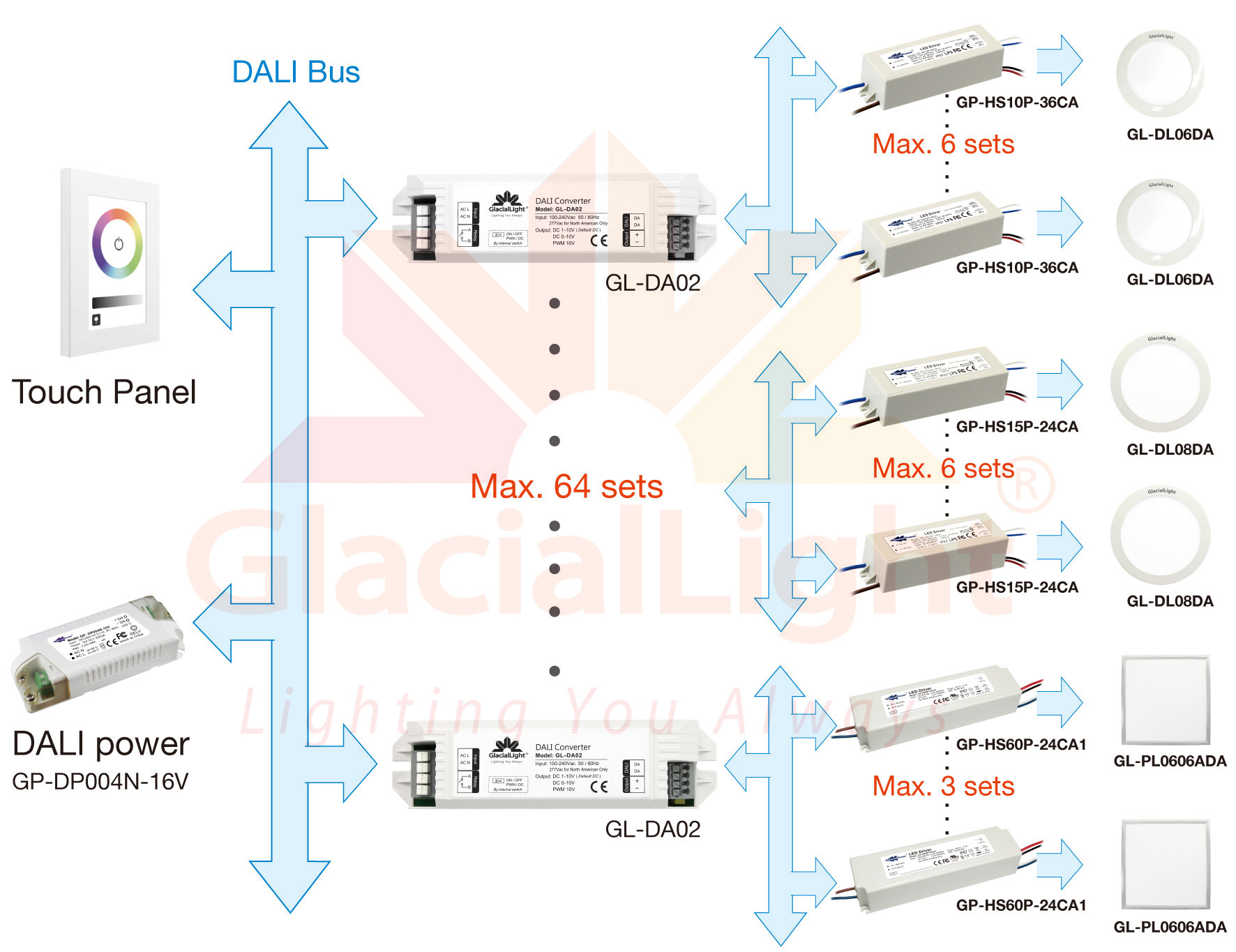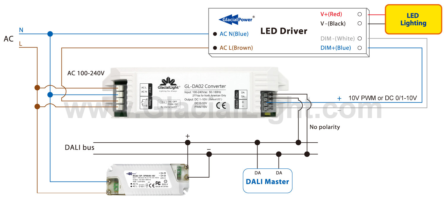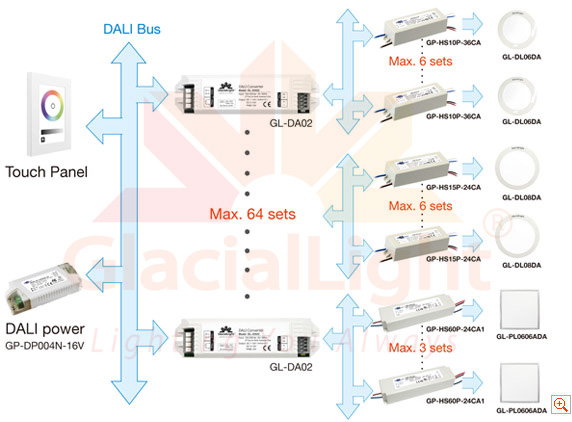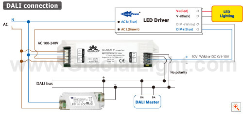 | DALI (Digital Addressable Lighting Interface) is an international standard, popular lighting control protocol BUS, With digital addressing dimming, stable, various dimming ways, easy to install. GL-DA02 adopt standard DALI dimming signal to transform 10V PWM dimming signal or transform DC 0/1-10V dimming signal. It is compatibility with IEC 62386 standard. Compared with traditional LED dimming way, have a wide range of dimming, various dimming way, high precision dimming, can inquire the state of lamps.