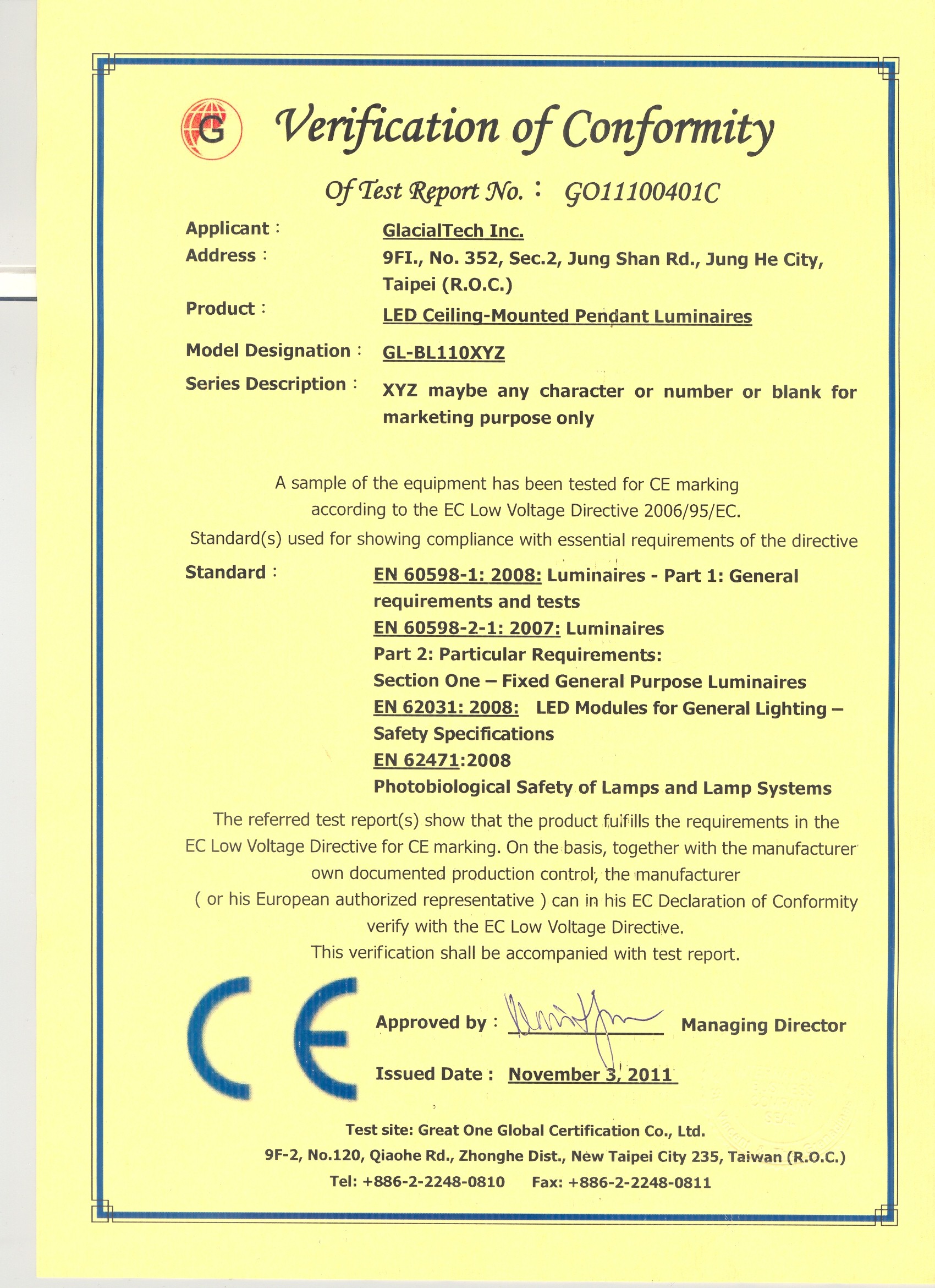 | 11. | Flood Light | GL-FL100 | CE/LVD | EN60598-2-1:1989; EN60598-1:2009 ; EN62031:2013 |